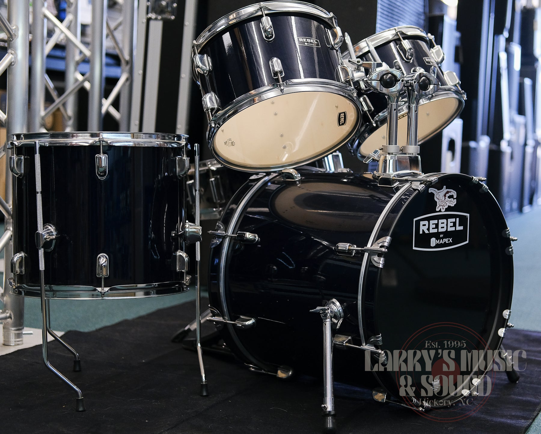 a used and in OK condition Mapex Rebel Kit in a very dark blue, almost black. It Could use some new heads and a good cleaning but other than that its functionally and structurally good